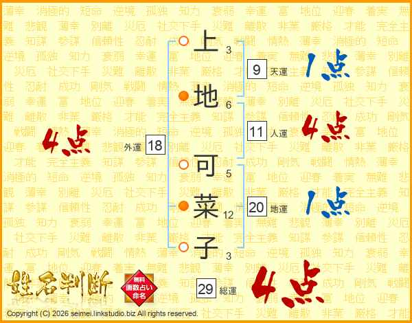 生活面を象徴する運勢です。外部から受ける影響力を表し、結婚運、家庭運や職場、環境への順応性を表します。総運から人運を引いた画数。姓や名が1文字の場合を除く。