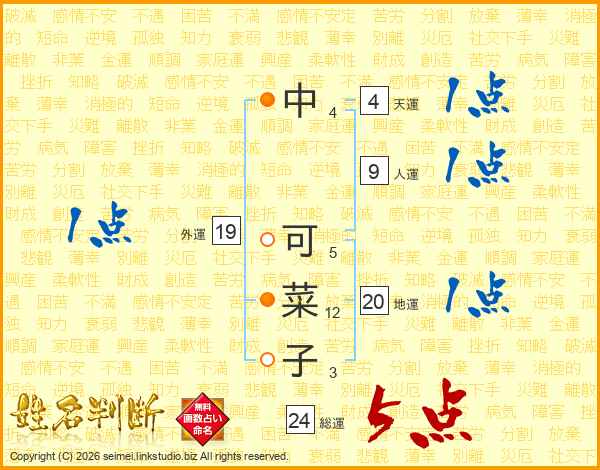生活面を象徴する運勢です。外部から受ける影響力を表し、結婚運、家庭運や職場、環境への順応性を表します。総運から人運を引いた画数。姓や名が1文字の場合を除く。