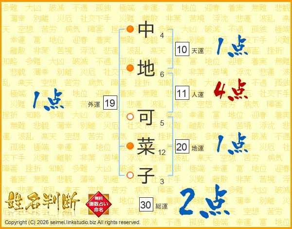 生活面を象徴する運勢です。外部から受ける影響力を表し、結婚運、家庭運や職場、環境への順応性を表します。総運から人運を引いた画数。姓や名が1文字の場合を除く。