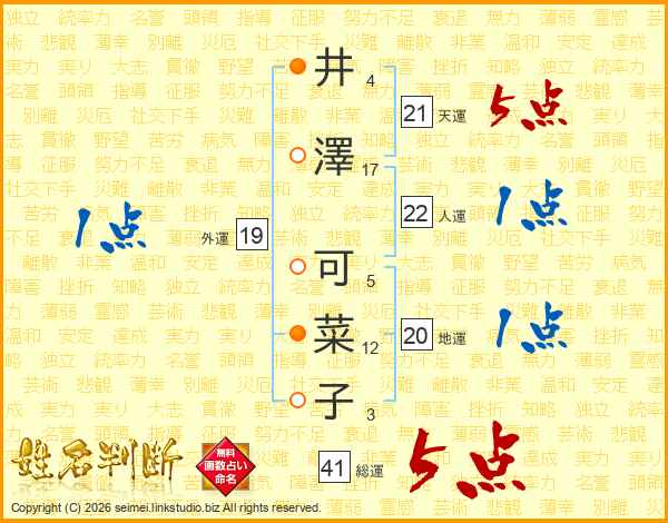 井(4画)澤(17画) 可(5画)菜(12画)子(3画)