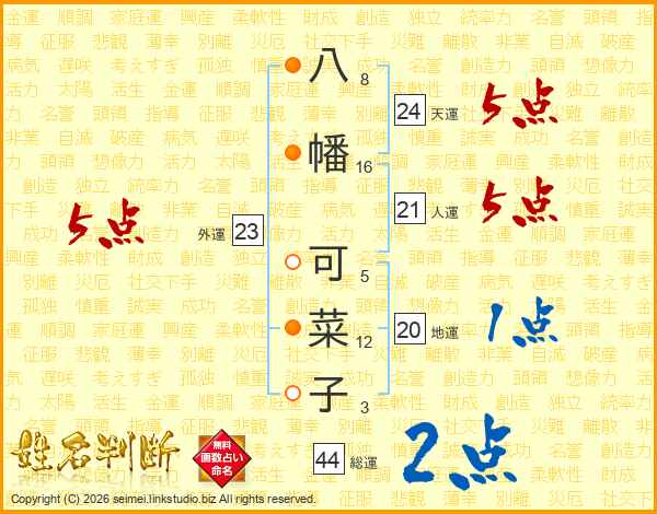 八(8画)幡(16画) 可(5画)菜(12画)子(3画)