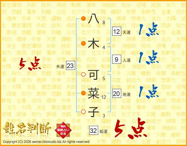 八(8画)木(4画) 可(5画)菜(12画)子(3画)