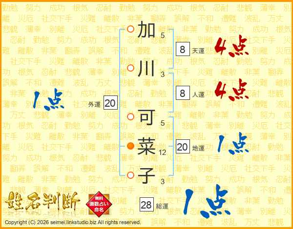 加(5画)川(3画) 可(5画)菜(12画)子(3画)