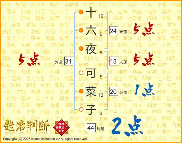 画数の奇数(○陽)と偶数(●陰)の配列で吉凶を占います。どちらかにかたよる名前は大凶名で避ける必要があります。画数の奇数偶数。