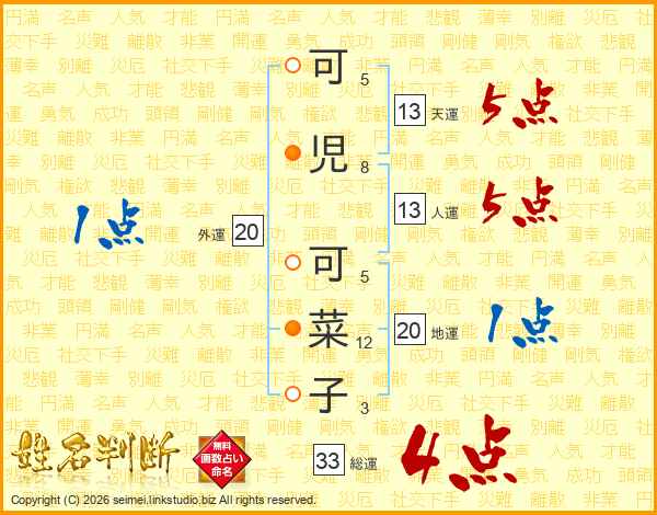 可(5画)児(8画) 可(5画)菜(12画)子(3画)