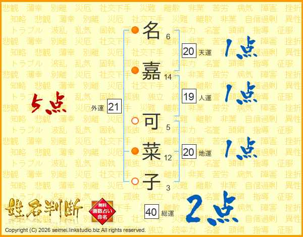 名(6画)嘉(14画) 可(5画)菜(12画)子(3画)