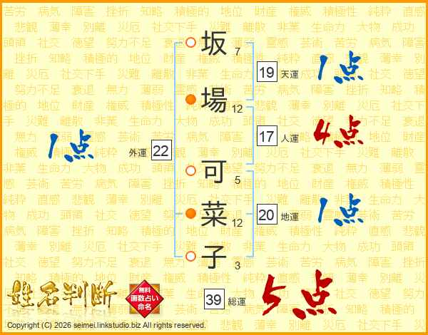 坂(7画)場(12画) 可(5画)菜(12画)子(3画)