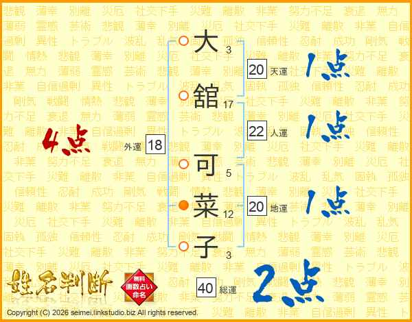 大(3画)舘(17画) 可(5画)菜(12画)子(3画)