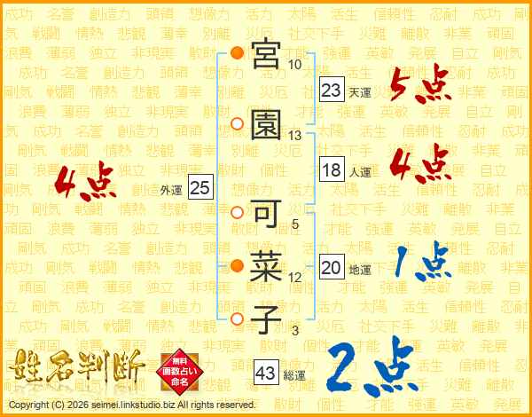 宮(10画)園(13画) 可(5画)菜(12画)子(3画)