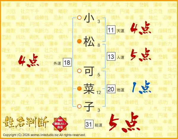 小松可菜子さんの総運は31画の5点!