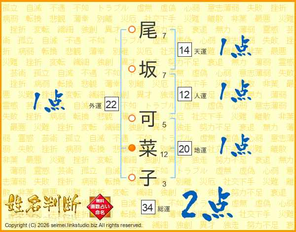 尾(7画)坂(7画) 可(5画)菜(12画)子(3画)