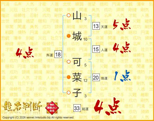 山(3画)城(10画) 可(5画)菜(12画)子(3画)