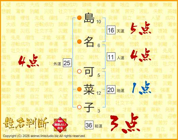 島(10画)名(6画) 可(5画)菜(12画)子(3画)