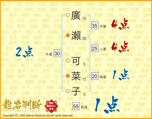 廣(15画)瀨(20画) 可(5画)菜(12画)子(3画)