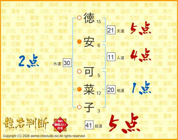 徳(15画)安(6画) 可(5画)菜(12画)子(3画)