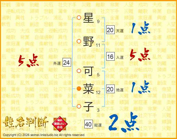 星(9画)野(11画) 可(5画)菜(12画)子(3画)