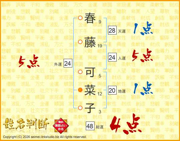 春(9画)藤(19画) 可(5画)菜(12画)子(3画)
