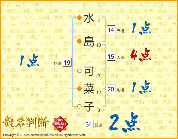 水(4画)島(10画) 可(5画)菜(12画)子(3画)