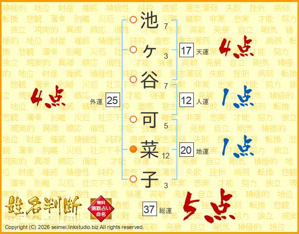池(7画)ヶ(3画)谷(7画) 可(5画)菜(12画)子(3画)