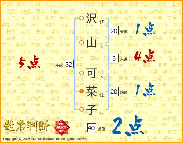 沢(17画)山(3画) 可(5画)菜(12画)子(3画)