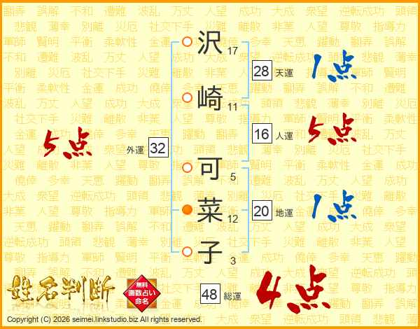 沢(17画)崎(11画) 可(5画)菜(12画)子(3画)
