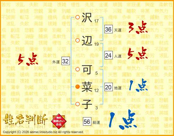 沢(17画)辺(19画) 可(5画)菜(12画)子(3画)