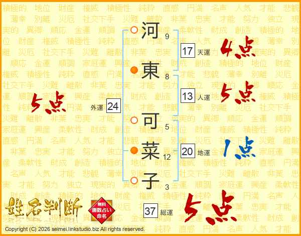 河(9画)東(8画) 可(5画)菜(12画)子(3画)