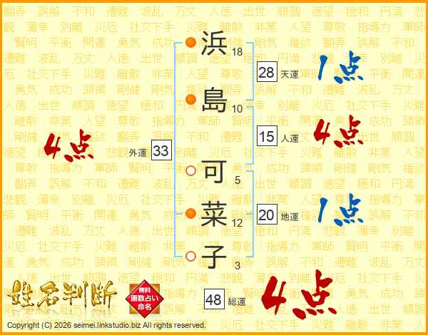 浜(18画)島(10画) 可(5画)菜(12画)子(3画)