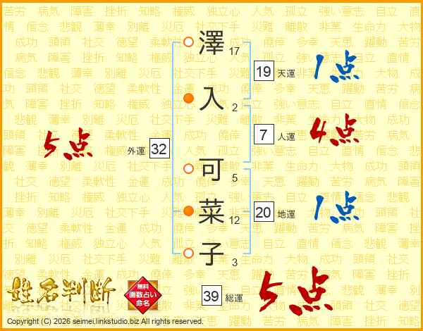 澤(17画)入(2画) 可(5画)菜(12画)子(3画)