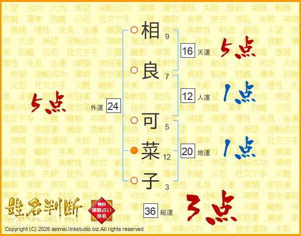 相(9画)良(7画) 可(5画)菜(12画)子(3画)