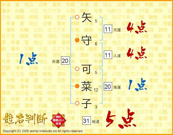 矢(5画)守(6画) 可(5画)菜(12画)子(3画)