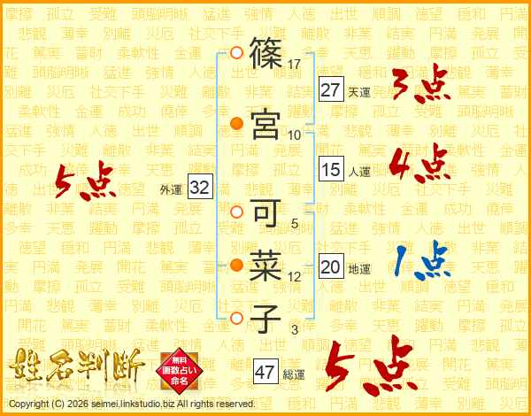 篠(17画)宮(10画) 可(5画)菜(12画)子(3画)