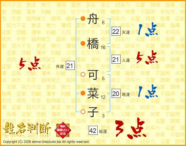 舟(6画)橋(16画) 可(5画)菜(12画)子(3画)