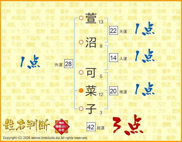 萱(13画)沼(9画) 可(5画)菜(12画)子(3画)