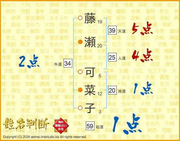 藤(19画)瀬(20画) 可(5画)菜(12画)子(3画)
