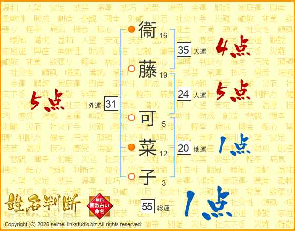 衞(16画)藤(19画) 可(5画)菜(12画)子(3画)