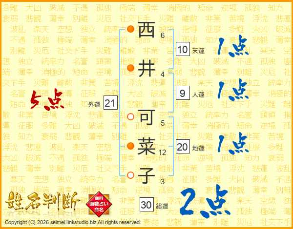 西井可菜子さんの総運は30画の2点!