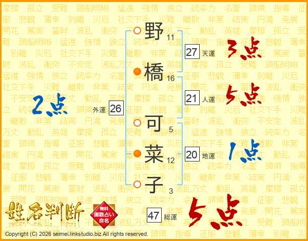 野橋可菜子さんの総運は47画の5点!