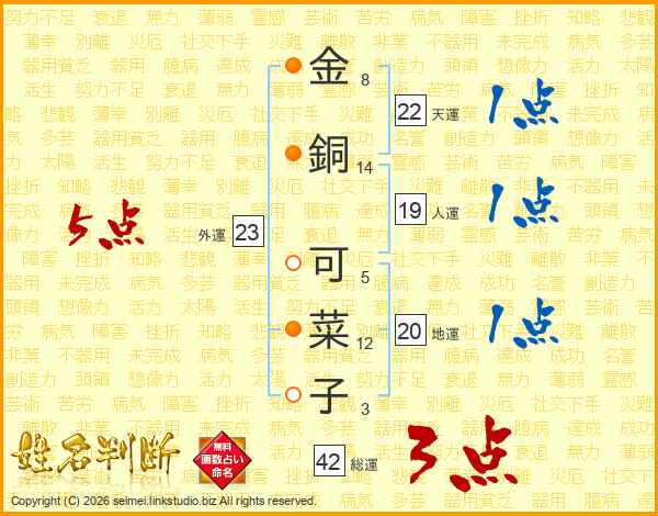 金(8画)銅(14画) 可(5画)菜(12画)子(3画)