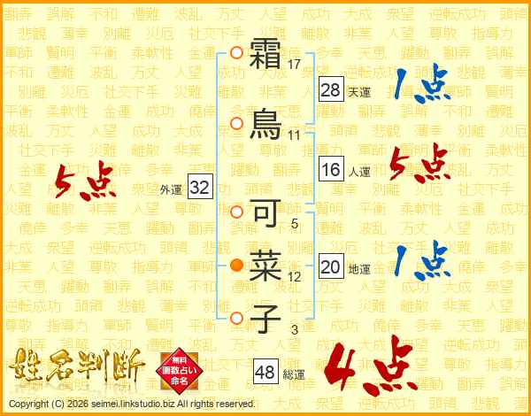 霜(17画)鳥(11画) 可(5画)菜(12画)子(3画)