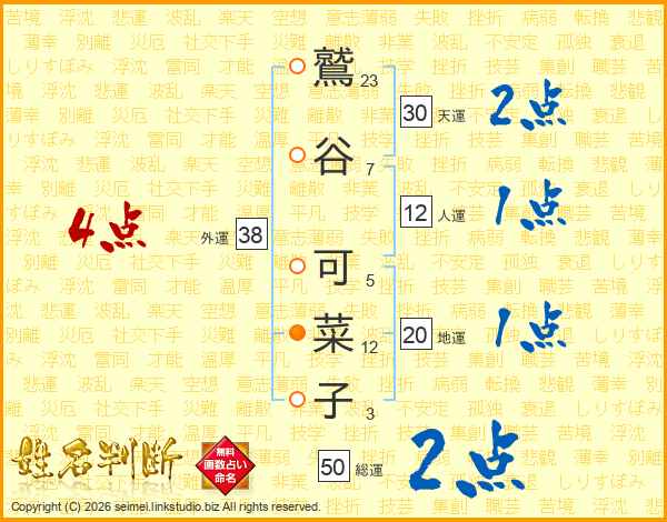 鷲(23画)谷(7画) 可(5画)菜(12画)子(3画)