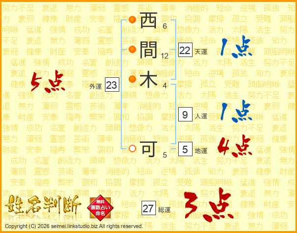 西間木可さんの総運は27画の3点!