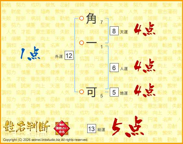 角一可さんの総運は13画の5点!
