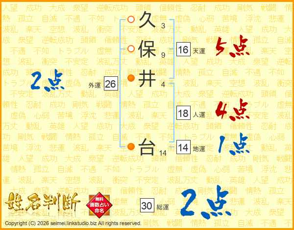 生活面を象徴する運勢です。外部から受ける影響力を表し、結婚運、家庭運や職場、環境への順応性を表します。総運から人運を引いた画数。姓や名が1文字の場合を除く。