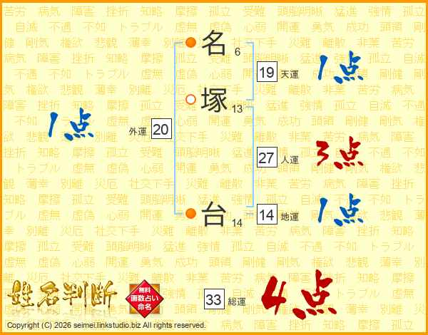 生活面を象徴する運勢です。外部から受ける影響力を表し、結婚運、家庭運や職場、環境への順応性を表します。総運から人運を引いた画数。姓や名が1文字の場合を除く。