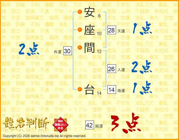 生活面を象徴する運勢です。外部から受ける影響力を表し、結婚運、家庭運や職場、環境への順応性を表します。総運から人運を引いた画数。姓や名が1文字の場合を除く。