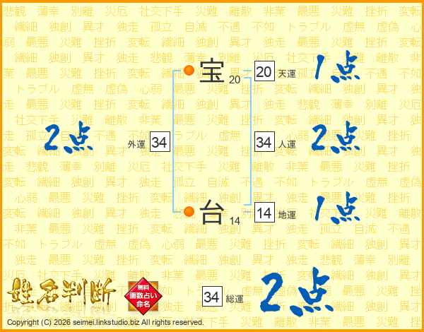 生活面を象徴する運勢です。外部から受ける影響力を表し、結婚運、家庭運や職場、環境への順応性を表します。総運から人運を引いた画数。姓や名が1文字の場合を除く。