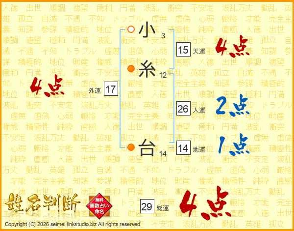 生活面を象徴する運勢です。外部から受ける影響力を表し、結婚運、家庭運や職場、環境への順応性を表します。総運から人運を引いた画数。姓や名が1文字の場合を除く。