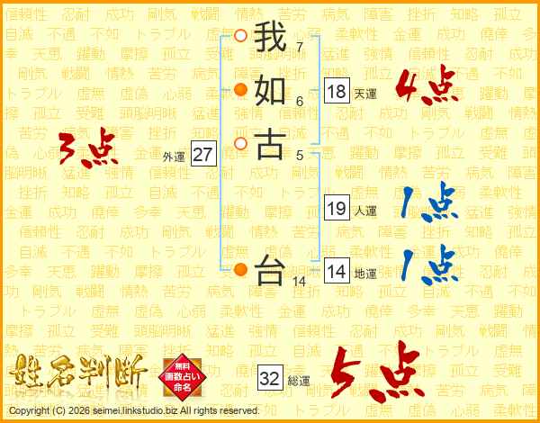 生活面を象徴する運勢です。外部から受ける影響力を表し、結婚運、家庭運や職場、環境への順応性を表します。総運から人運を引いた画数。姓や名が1文字の場合を除く。