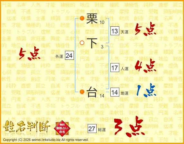 生活面を象徴する運勢です。外部から受ける影響力を表し、結婚運、家庭運や職場、環境への順応性を表します。総運から人運を引いた画数。姓や名が1文字の場合を除く。